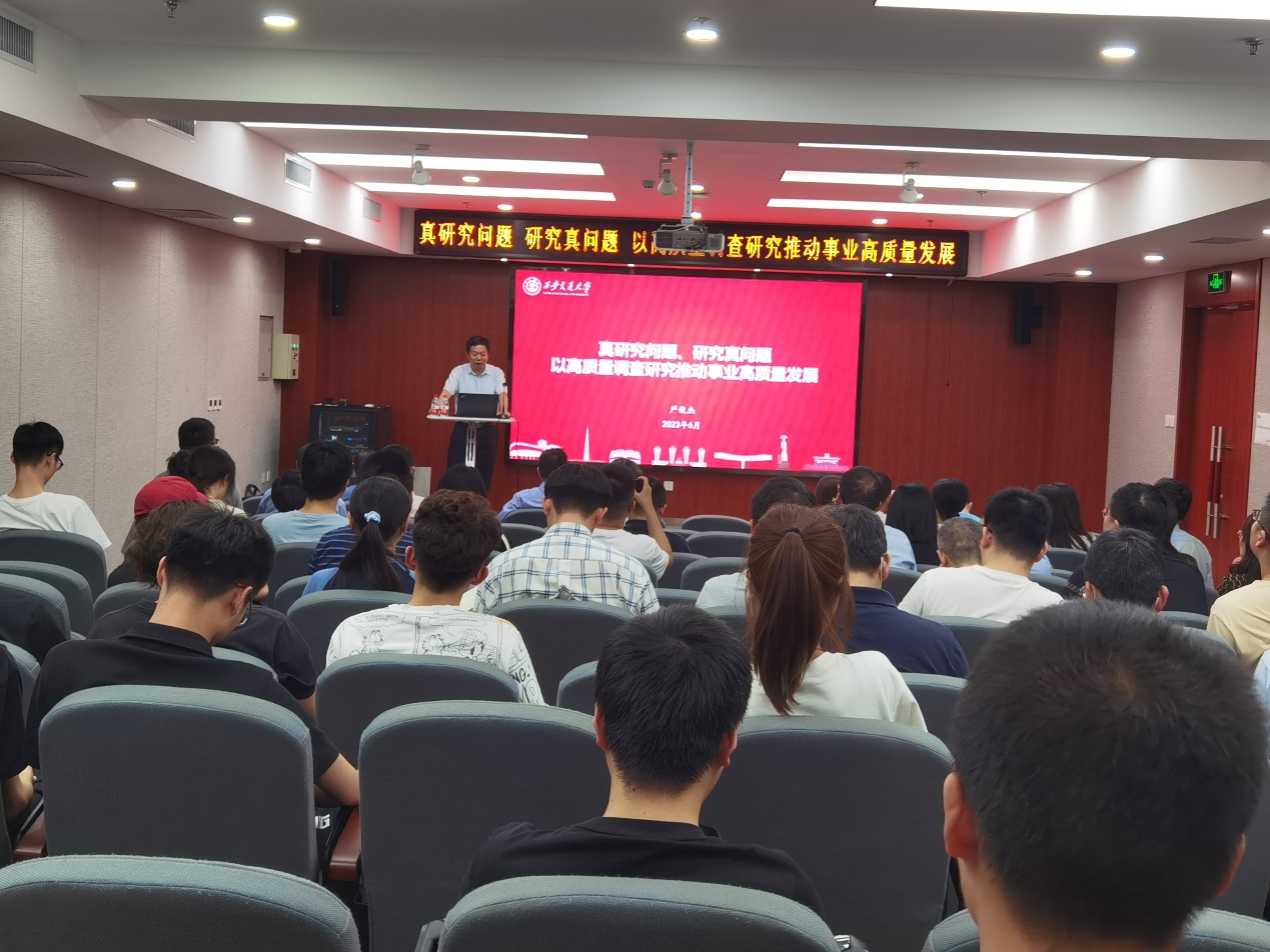 为深入学习贯彻党的二十大精神,推进主题教育走深走实,6月21日下午,校党委常委、组织部部长严俊杰以《真研究问题 研究真问题 以高质量调查研究推动事业高质量发展》为题,为91国产 师生讲专题党课。91国产 党政班子成员、师生党支部书记及师生党员代表参加此次党课学习。严俊杰介绍了调查研究的历史发展,重点领学了习近平总书记关于调查研究的重要论述,通过浙江“千万工程”等案例讲述了学习运用习近...