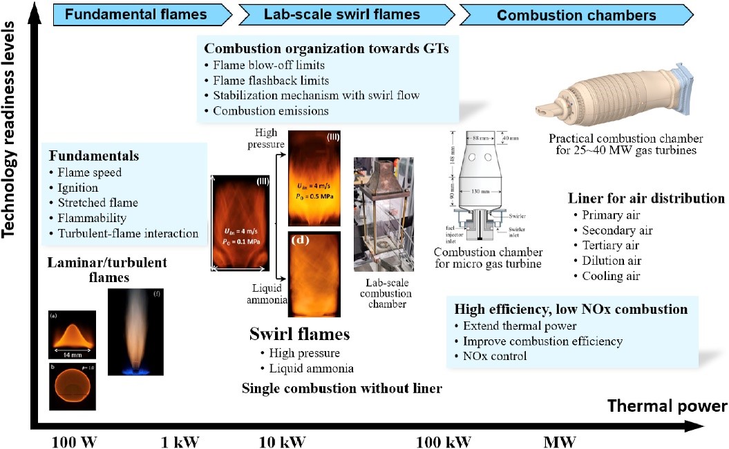 由于二战时期能源安全问题,早在上世纪就有过将氨作为燃料的研究热潮。早期尝试证明氨燃气轮机不仅点火困难而且表现出极低的燃烧效率,且稳定运行的范围非常狭窄。近年来由于气候变化问题重新将零碳燃料利用推向研究热点。近10年来国内外虽然针对氨在燃机方面已开展了大量的研究,但仍然存在两个方面主要问题:1)由于燃烧慢引起的高效稳定燃烧以及燃烧强化;2)燃料型NOx排放控制。目前虽然已有大量基础研究工作,然而有效的燃烧组织、燃烧强化、NOx控制策略并不明晰。本综述论文在团队氨燃烧系统研究工作基础上,对国内外本领域研究工作进行全面总结梳理,阐明了氨燃烧稳定本质机理,系统阐述了氨燃烧强化方法以及应用于燃机的可能性,从NOx生成路径以及燃烧组织方面论述了面向燃机的NOx控制策略,阐明了基础燃烧、实验室旋流燃烧和燃机燃烧室关联性。最后提出了未来氨燃料燃机研究领域的基础研究方向、研究方法拓展,以及未来潜在的燃烧技术。本综述论文可以为未来提供研究方向参考,发展燃机技术提供理论支撑。