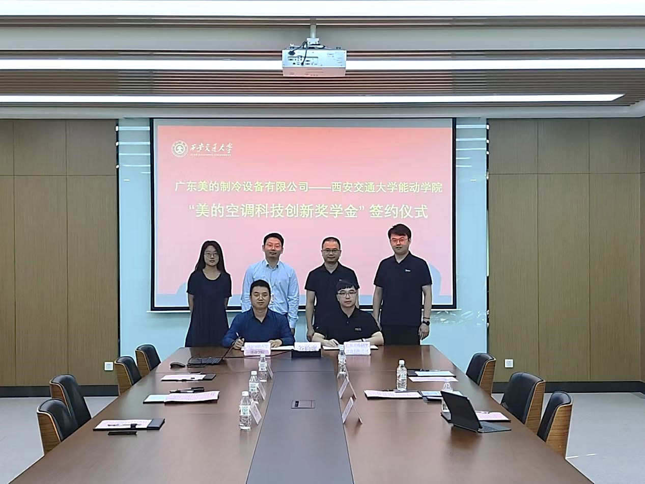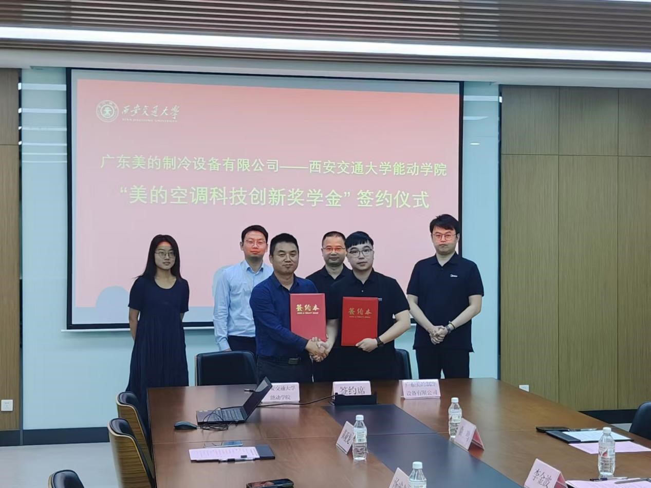 随后,汤成龙代表学院与广东美的制冷设备有限公司签订了“美的空调科技创新奖学金”捐赠协议,双方代表握手并合影留念。