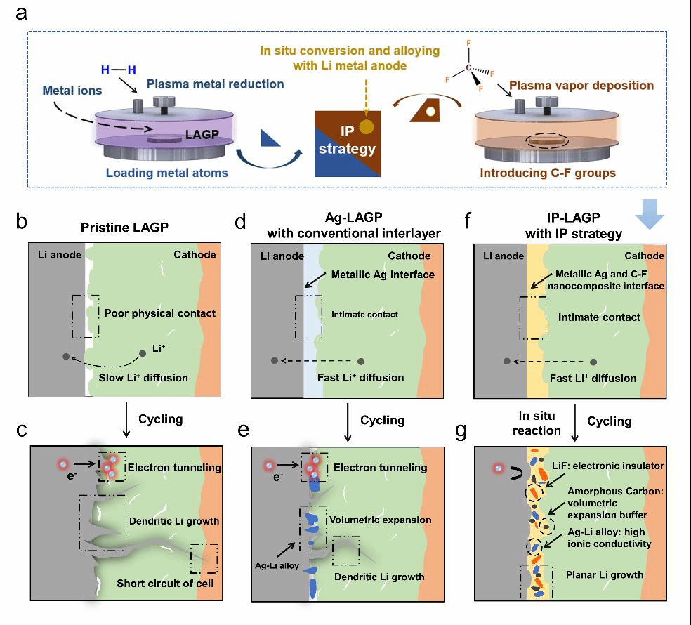 (2)凭借高能量密度和高热稳定性等优势,由固态电解质及锂金属负极组成的固态锂金属电池展现出了巨大应用潜力,被认为能从根本上解决商用锂电池中隔膜及电解液的易燃问题。然而相关研究表明,锂枝晶的无序生长会引发固态电解质内部裂纹拓展、缺陷孔隙放大,进而造成固态电池失效短路。为解决该问题,研究团队提出了一种“整合等离子体(Integration Plasma)”界面工程策略,在固态电解质表面构筑了由金属元素、电负性元素、碳元素组成的化学调节层。该人工界面层可通过与锂金属负极之间的原位反应,同步生成锂-金属合金(快离子导体)、氟化锂(电子穿梭抑制剂)、非晶态碳(体积变化缓冲剂)等化学物质,有利于实现固态电解质表面均匀的电场分布和锂沉积,从而有效阻止了锂枝晶在固态电解质内部的生长,大大延长了固态电池的循环寿命。该成果以“Integration Plasma Strategy Controlled Interfacial Chemistry Regulation Enabling Planar Lithium Growth in Solid-State Lithium Metal Batteries”为题发表在材料领域知名期刊《先进功能材料》(Advanced Functional Materials)。
