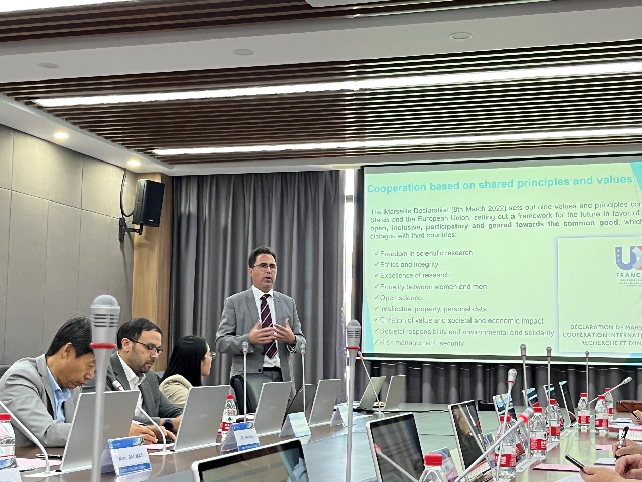 杜马科参赞代表法国驻华大使馆回顾了中法在高等教育领域的合作历史。他表示,法国驻华大使馆将一如既往地对西安交大和法国高校及企业之间的合作交流提供资源支持和必要协助,并高度评价了西安交大在对法合作中付出的努力和所取得的成就,希望此次来访将进一步加深法国高校和研究机构与西安交大在高等教育领域的交流与合作。