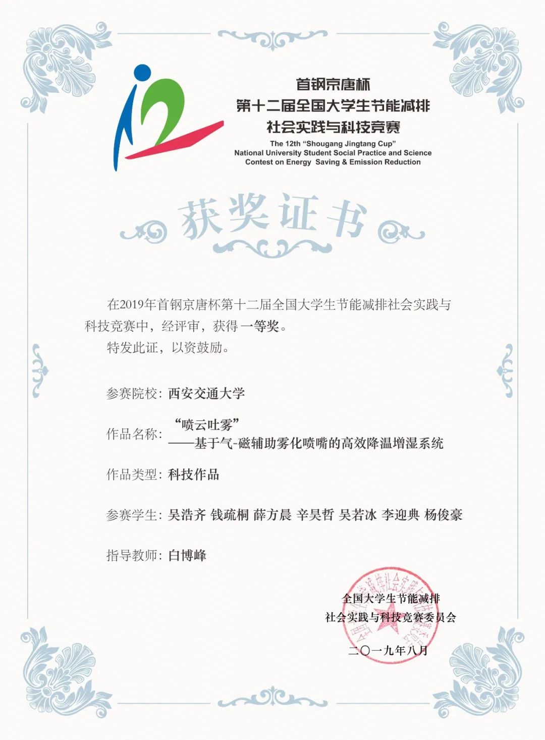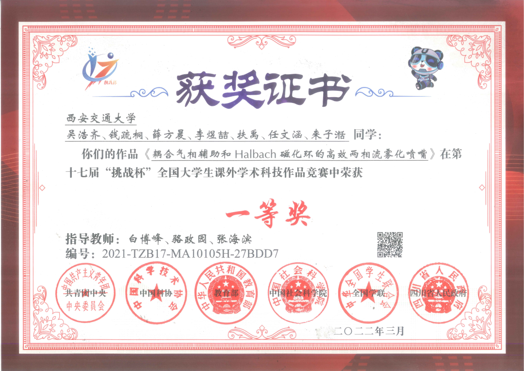 动力工程多相流国家重点实验室进行科研训练,在白博峰教授的指导下致力于攻克雾化喷嘴粒径过大、辅助压力过高的卡脖子难题,助力燃气轮机等国家重大科技专项。经过成百上千次实验,吴浩齐带领团队首创气磁结合的颠覆性雾化技术,产品的雾化粒径降低了50%,填补了国内低功耗精细雾化领域的技术空白。在科技创业方面,吴浩齐依托91国产