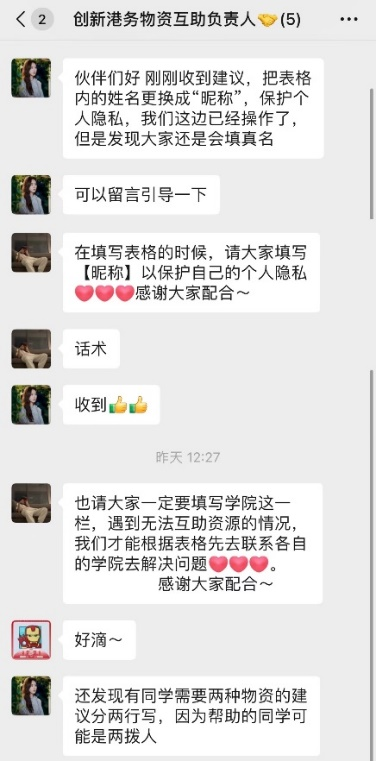 能动澎湃先锋队在帮助本院生活区的同学的同时也积极与其他学院先锋队合作,共同维护生活物资互助平台。