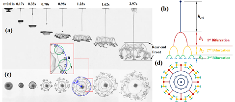 该论文利用高速相机研究了一系列重液滴撞击液池后从形成涡环、涡环失稳解体下沉、到分叉生长并最终成长为一朵分形花朵的奇特行为,通过系统分析,获得了上述各阶段的无量纲控制方程,揭示了其发生与演化的底层物理机制。研究发现涡环经历了以失稳解体为转折点的“稳态下沉”和“分岔生长”等两阶段演化,期间粘性阻力和重力通过重力加速度和瑞利-泰勒不稳定性(R-T instability)交替控制液滴裂变与生长行为,最终液滴通过涡环成长为一朵迷人的分形花朵。