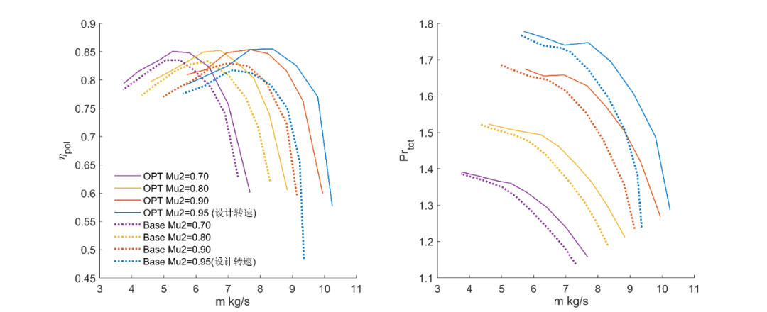本次优化设计及实验验证工作是对人工智能辅助支持的离心叶轮全三维优化方法的初次验证,试验件的加工由沈鼓完成,试验测试在西安交大-沈鼓研究院800kW试验台上进行。优化所使用的原型叶轮是经过试验验证的大流量系数高性能离心压气机模型级,包括进出口管路、叶轮、无叶扩压器及蜗壳,原型叶轮在设计转速下压缩机整机级效率可达83%。在对离心叶轮进行全三维优化后,在保持压比不低于原型级的情况下,设计转速下的最高级效率提升至86%。这一结果充分表明了基于人工智能辅助的全三维设计优化体系的优越性以及潜在价值。