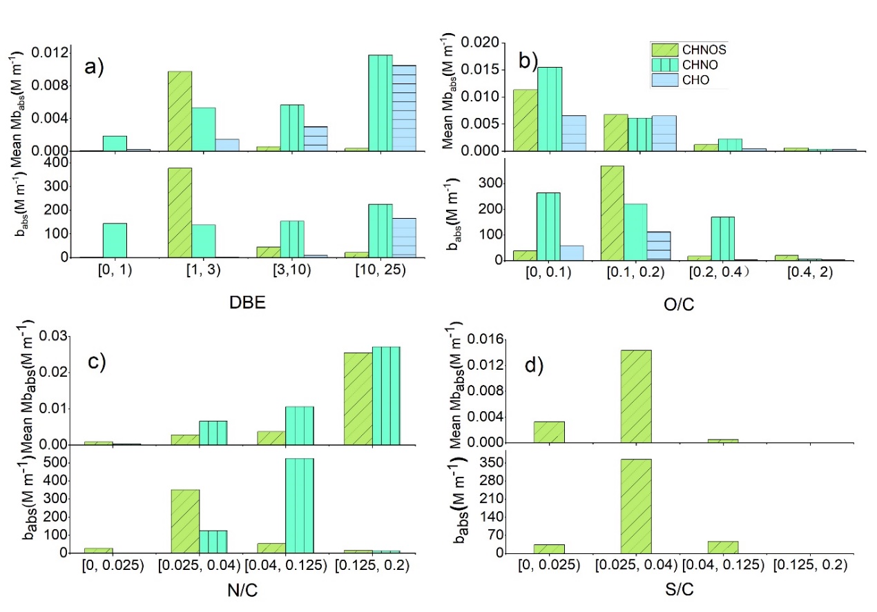 图 棕碳分子DBE、O/C、N/C、S/C分级吸光贡献
