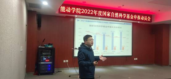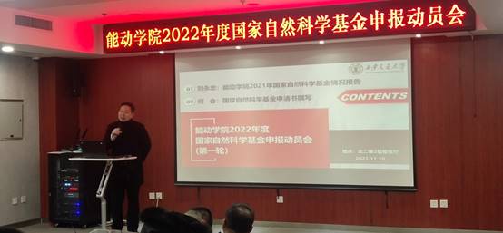 2021年基金工作的得失,对学院2022年基金申报工作做动员,表示“申请书是写给基金委的一封情书”,学院教师要结合自身研究工作、提早谋划申报意向、主动与业界专家沟通思路、反复打磨申请书品质。学院将精心组织多轮申请书动员、评审工作以进一步提高申请书质量,期望学院2022年基金工作取得佳绩。