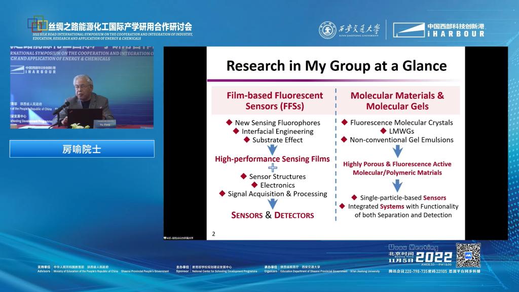 房喻院士作了题为“Film-based Fluorescence Sensors — From Concepts to Applications”学术报告,介绍了薄膜荧光传感器的重要价值及面临的挑战,分享了他们长期研发高性能薄膜荧光传感器的攻关历程和取得的理论技术创新,并从概念提出到商业应用全方位展示了其科研团队在制备自支撑、无缺陷、高度光滑的荧光纳米薄膜方面的产学研用成果。