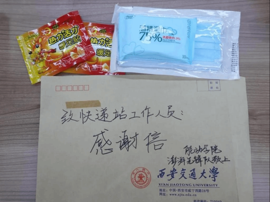 澎湃先锋队还建立了宣传联系组和心理疏导组。宣传联系组已在“交大能动研究生”开设“同心防疫”信息专栏,及时传递最新防疫资讯与学校后勤保障信息;心理疏导组依托学院公众号“交大能动研究生”的“心情树洞”栏目,开设“‘疫’不容辞,共克时艰”专栏,邀请同学们参与投稿,“最近我们的‘心情树洞’栏目会有一些同学们对疫情的感受,也会有大家对学校工作人员的感谢。”李彤介绍到。为了表达对工作人员的感谢,传达能动学子的心意,能动澎湃先锋队组织队员为在漫天大雪中辛勤工作的工作人员和志愿者们送去暖宝宝,同时也为在快递站日夜坚守的快递人员送去感谢信。“不仅为同学们服务,也为志愿者们服务”,这是澎湃先锋队的初心,也在刺骨寒风中营造了温暖互助,同心战疫的浓厚氛围。