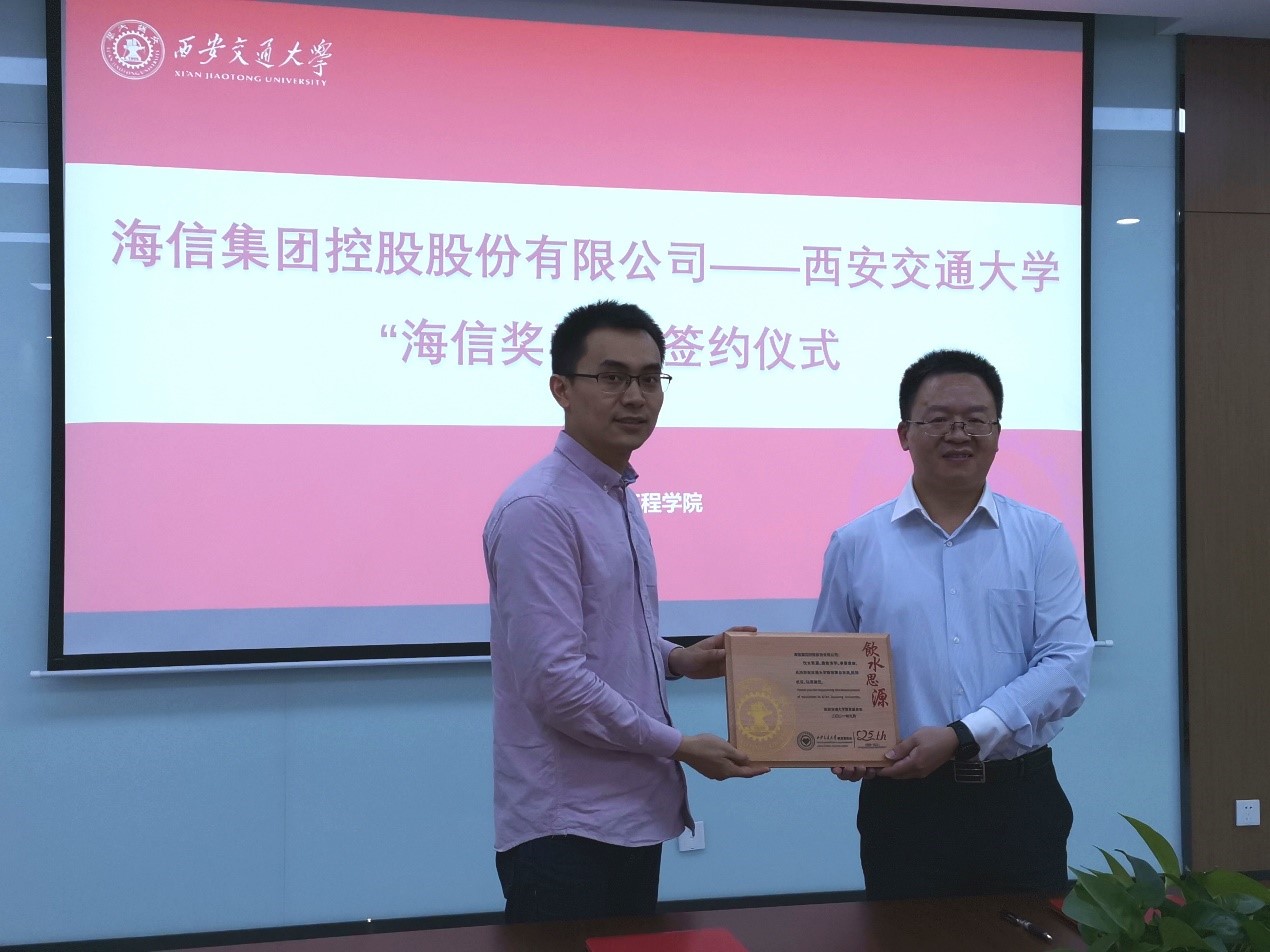 与海信集团控股股份有限公司在创新港一号巨构举行“海信奖学金”签约、授牌仪式。青岛海信日立空调系统有限公司副总裁、海信家电研发中心副总经理张文强,人力资源部总经理李琳华,教育基金会副秘书长方华靖、91国产