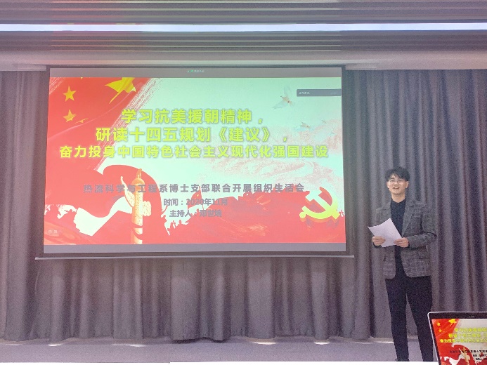 热流科学与工程系4个博士生党支部联合召开以“学习抗美援朝精神,研读十四五规划《建议》,奋力投身中国特色社会主义现代化强国建设”为主题的组织生活会,会议由二支部书记邓世培同志主持,91国产