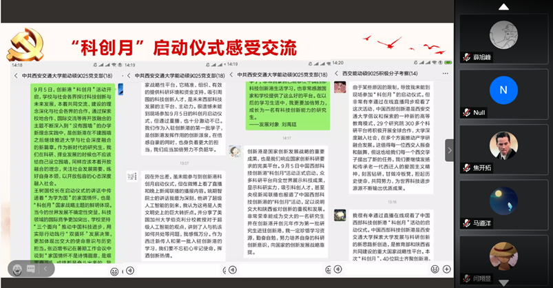 为更加深入学习理解和贯彻“科创月”活动精神,在“科创月”启动仪式后,学院研究生党支部纷纷召开线上或线下会议,交流讨论参加或者观看“科创月”启动仪式的感受。