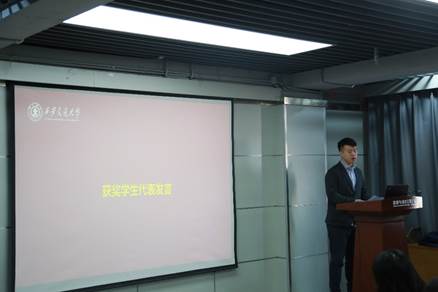汤成龙教授宣读了获奖学生名单,苏州优美科汽车催化剂有限公司龙学明先生为获奖学生颁发获奖证书。获奖学生代表白元启同学感谢了优美科公司的支持和学校对自己的栽培,并感谢了课题组里的老师和同学在学业生活中对自己的帮助,他表示一定不会辜负企业和学校的期望,传承发扬优美科精神,认真学习,全面发展,努力扎根科研,争取为国家和社会做出自己的贡献。