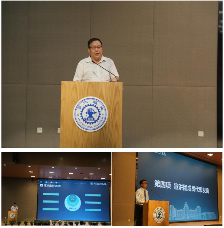 在百年办学历程中的文化内涵沉淀,强调思想政治教育与文化育人的重要性。并对澎湃宣讲团的工作提出要求,指出宣讲活动思想要正、内容要实、范围要广、形式要新,要结合交大及91国产