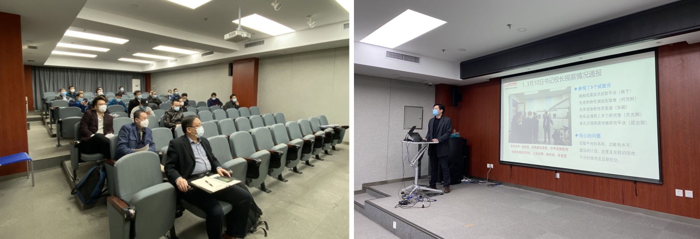 孙中国首先向大家介绍了学院目前为止创新港能源科学与技术研究院的建设进度,包括已经完成的各项工程及正在进行中的一些试验台、公共空间的建设情况;同时,通报了学校张迈曾书记、王树国校长等一行人员3月10日到我院检查创新港建设进度的情况,以及对后续工作的具体要求等。学院也对后续的工作进行了详细部署,要求各系所全力配合、共同推进创新港的试验台建设。