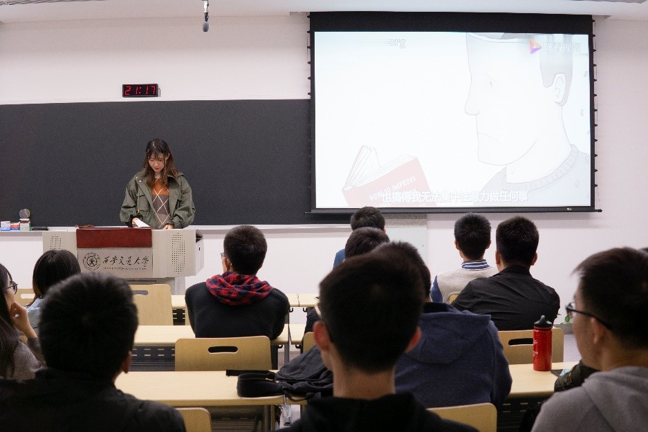 情绪排解分享阶段,同学们结合自身情况,分享了适合自己的排解方法;《我有一只叫“抑郁症“的小黑狗》短片以一种新颖、易于接受的方式向同学们展示了抑郁症及其发展、我们应如何与“小黑狗”共处等信息。