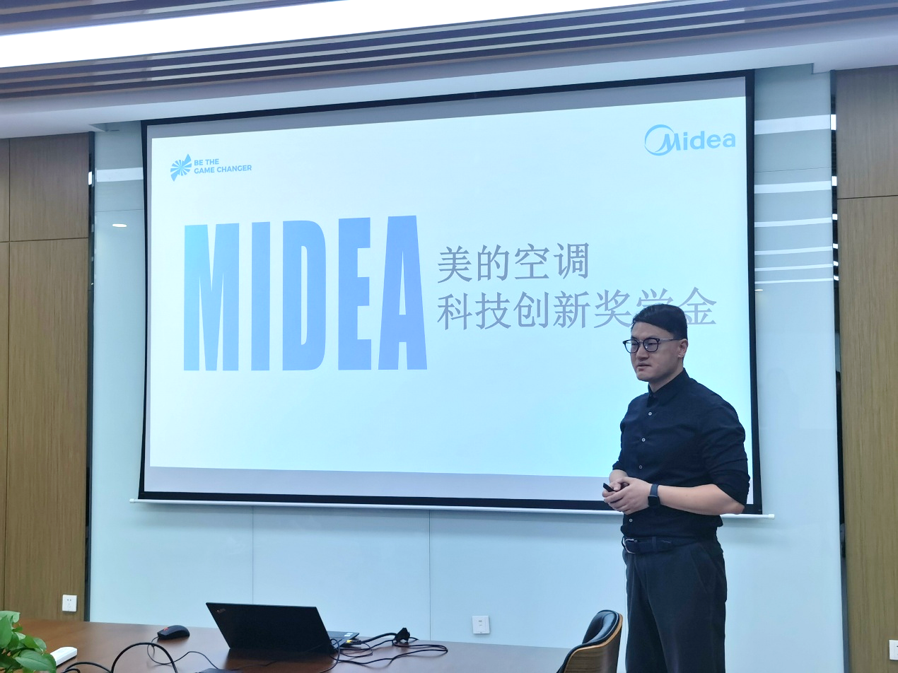 接着,美的集团家用空调事业部研发支持与技术策略部长刘东子先生对美的集团的家用空调人才合作项目进行介绍,他对获奖学生表示衷心祝贺,介绍了美的集团家用空调事业部的研发实力、制造布局以及文化建设,也欢迎大家进一步了解和加入美的集团。