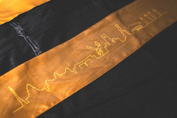 绶带数码印学校地标建筑线条图,勾勒百年学府传承脉络,构建时空交叠的校园记忆图谱。