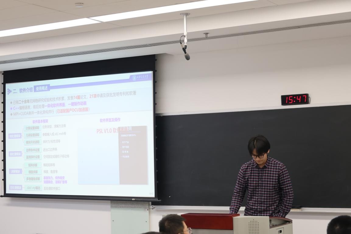 刘秉淳同学作为席光教授流体机械创新团队代表,重点介绍了团队自主研发的无网格粒子法软件PSL的功能与使用场景。他通过实例演示,详细讲解了该软件在流体机械数值模拟中的优势,以及在科研项目与工程实践中的应用成果,为双方研究生提供了可借鉴的技术经验。深入浅出的讲解让在场师生对国产数值模拟软件的研发与应用有了更深入的认知,为后续跨领域技术合作埋下伏笔。