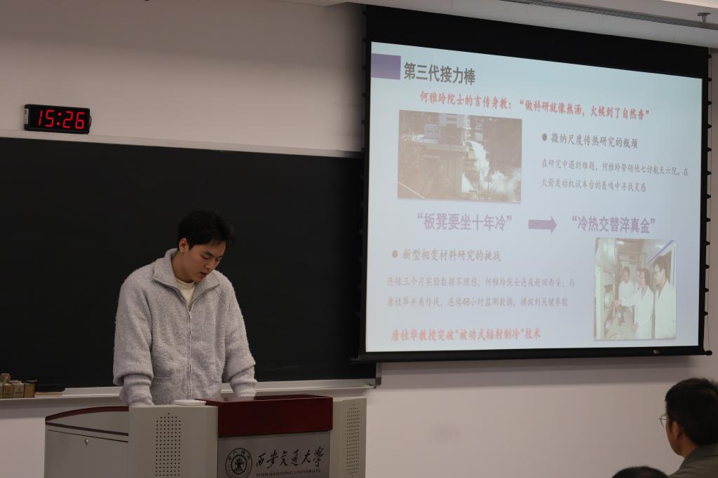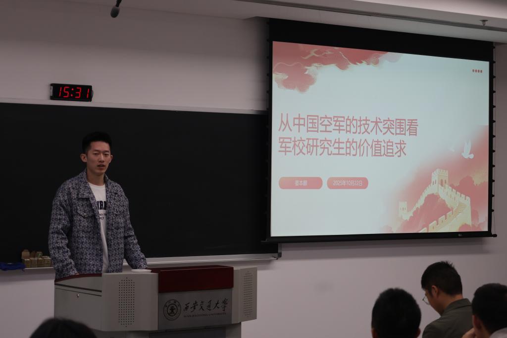 学生团支部宣讲团成员郑俊龙同学,以《热流不息,薪火相传》为题,结合能动学科发展历程与科研团队传承故事,阐述了高校科研工作者“扎根领域、久久为功”的坚守;随后,空军工程大学研究生院2023级硕博连读研究生姜本麒同学,带来《从人民空军技术突围看当代军校研究生的价值追求》主题交流,通过回顾人民空军技术突破历程,展现了军校研究生“面向国防需求、勇攀技术高峰”的使命担当。两位同学的分享从不同维度诠释了科研精神的核心内涵,引发在场师生强烈共鸣,现场掌声持续不断。