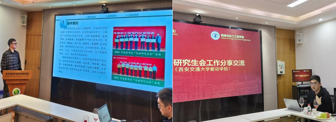研究生会潘泽嘉、西北农林科技大学林学院研会主席团成员李亚轩分别代表研究生会从加强思想引领、深化组织改革、丰富校园文化、涵养优良学风、促进社会融入何创新服务内容等方面展开交流分享。