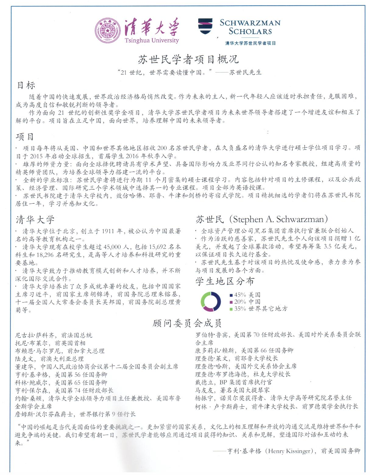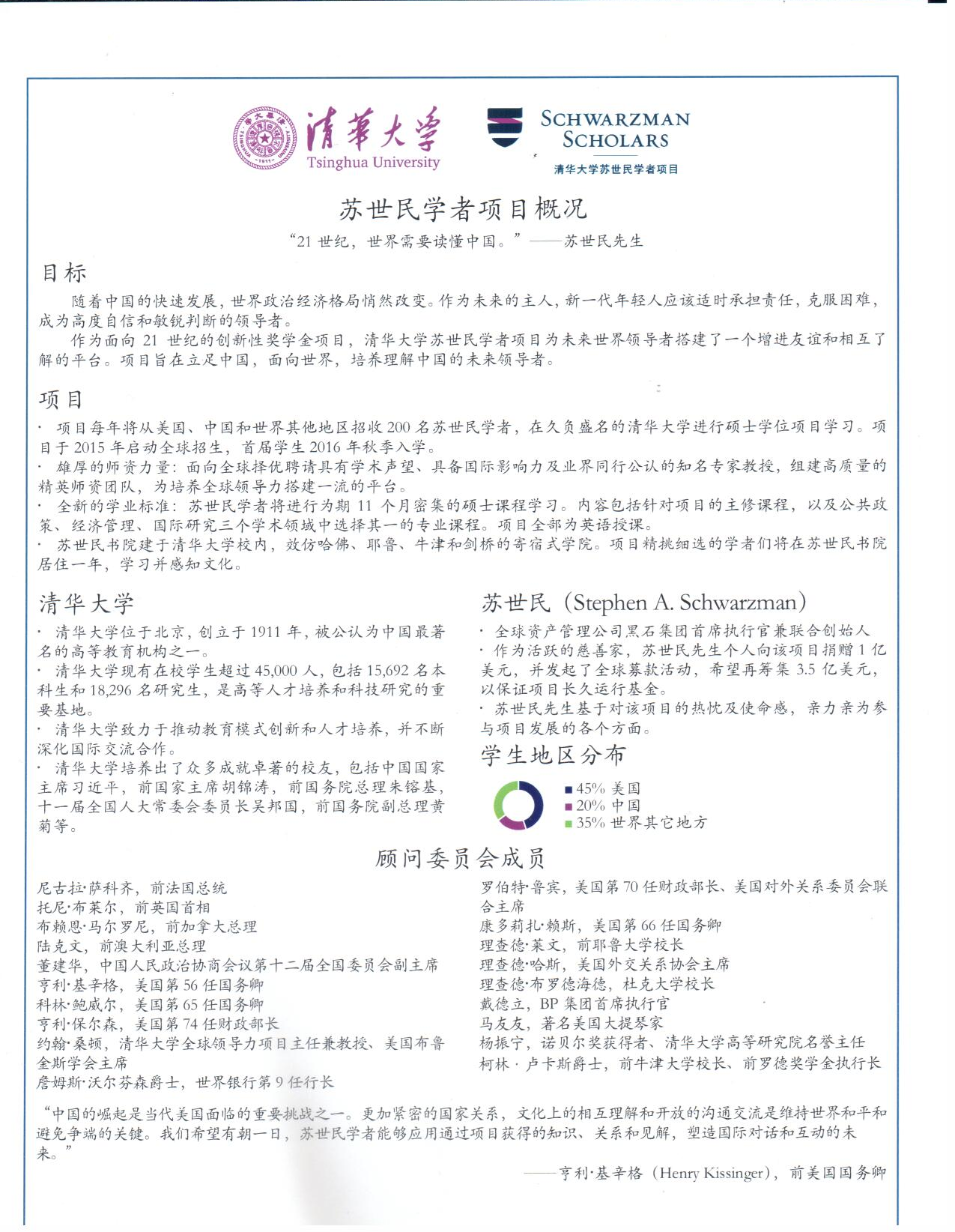 清华大学苏世民学者项目旨在培养跨文化的全球领导力,以迎接和应对21世纪以来全球面临的挑战。该项目每年将从美国、中国和世界其他地区招收200名苏世民学者,在久负盛名的清华大学进行为期一年的硕士学位项目学习。项目为全额奖学金支持项目。