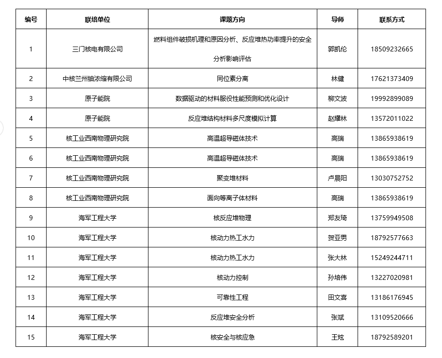 与中核集团、海军工程大学联合招收培养硕士研究生。招生安排如下:
