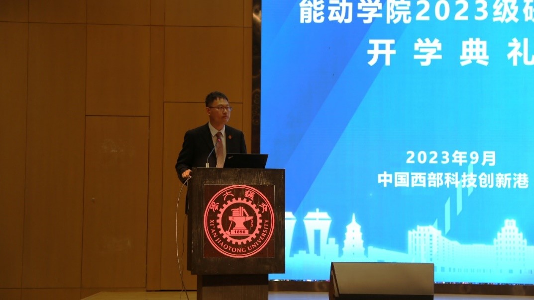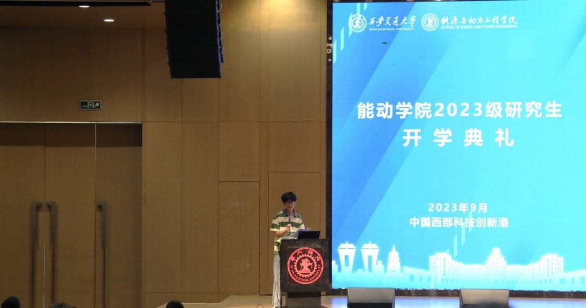硕3029班姚鑫同学作为新生代表进行发言。他表示,将在新起点上弘扬传承西迁精神,心怀家国,赓续奋斗;未来将不断磨砺自身本领,立足于专业,将个人理想和国家发展、人类文明紧密联系在一起,为实现双碳目标发挥绵薄之力,为实现中华民族伟大复兴的中国梦贡献青春力量。