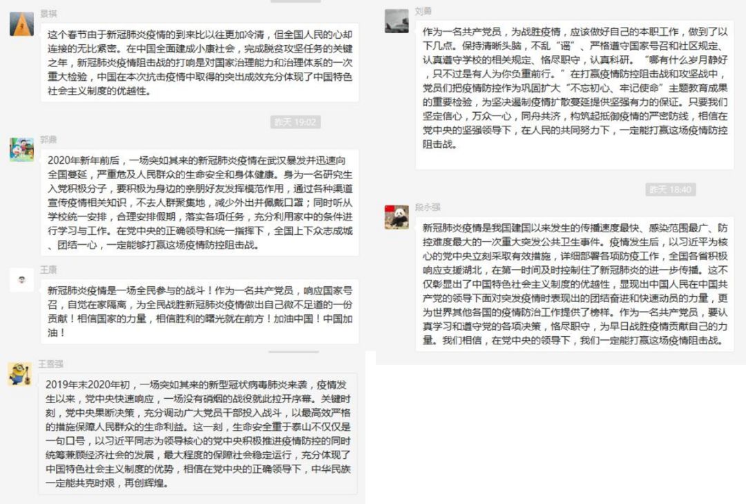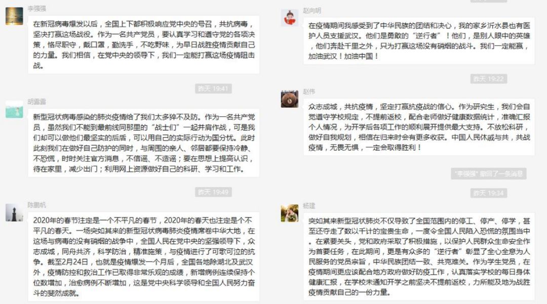 在新型冠状病毒感染肺炎疫情防控工作的关键时期,为深入学习习近平总书记关于防控新型冠状病毒感染肺炎疫情的重要指示精神,热流科学与工程第三党支部于2020年2月25日开展“众志成城 共抗疫情”线上专题组织生活会,引导党员坚定战胜疫情信心决心,提高自我防护意识,保持头脑清醒,坚决做到不造谣、不传谣、不信谣,安全、有序地参与防控工作。会议由支部书记杜秋晚主持。