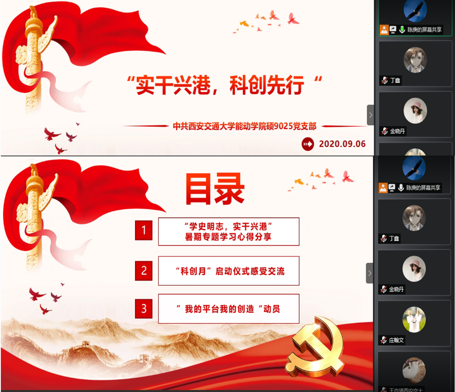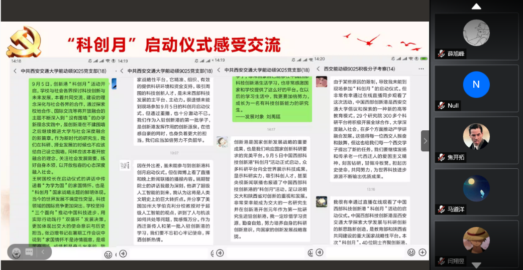 本次会议由支部书记陈庚主持,支部成员分享了各自的暑期学习心得,相互进行点评交流;同时,支部同志积极分享了参加或观看9月5日上午“科创月”启动仪式的切身感受;最后,与会成员纷纷表示要立足自身平台,积极参与科研学习,助力创新港构建科教高地,为交大腾飞贡献力量。会议采取线上方式进行。