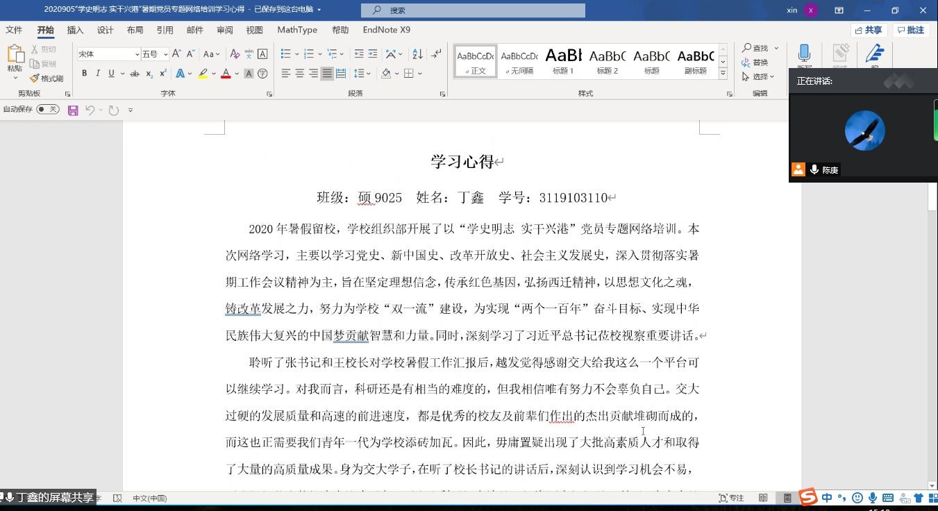会议第一项,丁鑫等同志分享了自己的“学史明志、实干兴港”暑期党员专题网络培训学习心得,表示学校假期安排的学习任务都非常有针对性和时政性,学完之后收获颇丰,比如通过《永远飘扬的旗帜》《战‘疫’一线党旗红》等记录片,让我们深刻地理解什么叫做“我是党员我先上”,也让我们年轻的学生党员更加深入地思考我们的入党初心,明确并牢记自己的使命担当。支部同志继续分别就自己的学习心得进行了展示交流,陈庚同志指出在暑期学习的张迈曾书记讲话中张书记反复强调了思想建设的重要性,而党员的思想性学习是思想建设中的重中之重,大家应该认真对待学习心得的撰写,做到真正学有所得。
