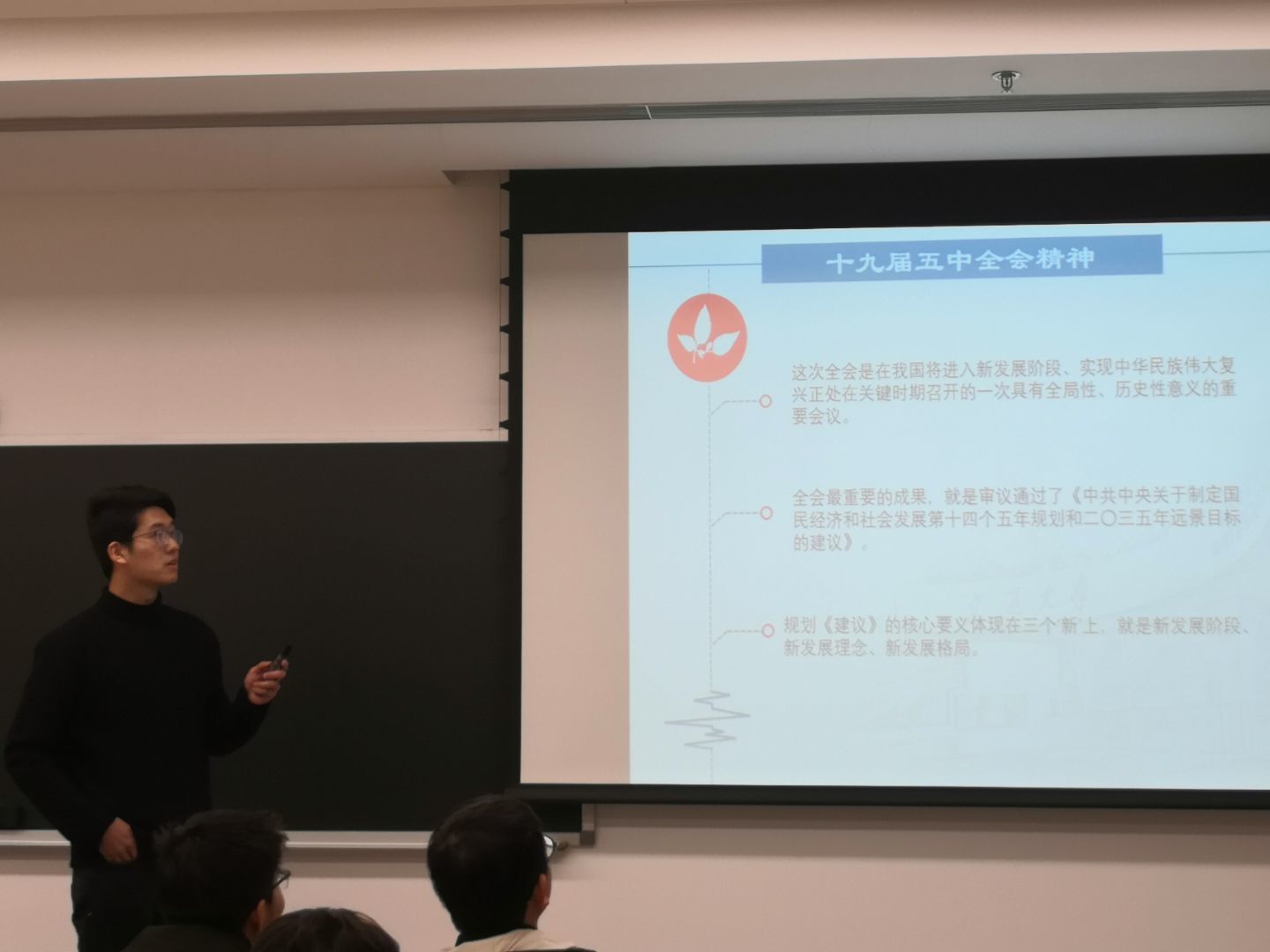 之后的讨论环节中,赖志贤、郑军强,王琛等同志对科技体制改革,技术创新体系提出了独到的理解,樊硕旺同志从方法论角度提出,实现二〇三五年远景目标需要我们做到坚定群众立场,审时度势、保持战略定力,补齐发展短板,敢于斗争、逢敌亮剑。现场被带动起了热烈的讨论氛围,所有同学都踊跃地进行了发言。大家都增进了对十九届五中全会精神的的认识,这些精神牢牢地在每个人心中扎根。