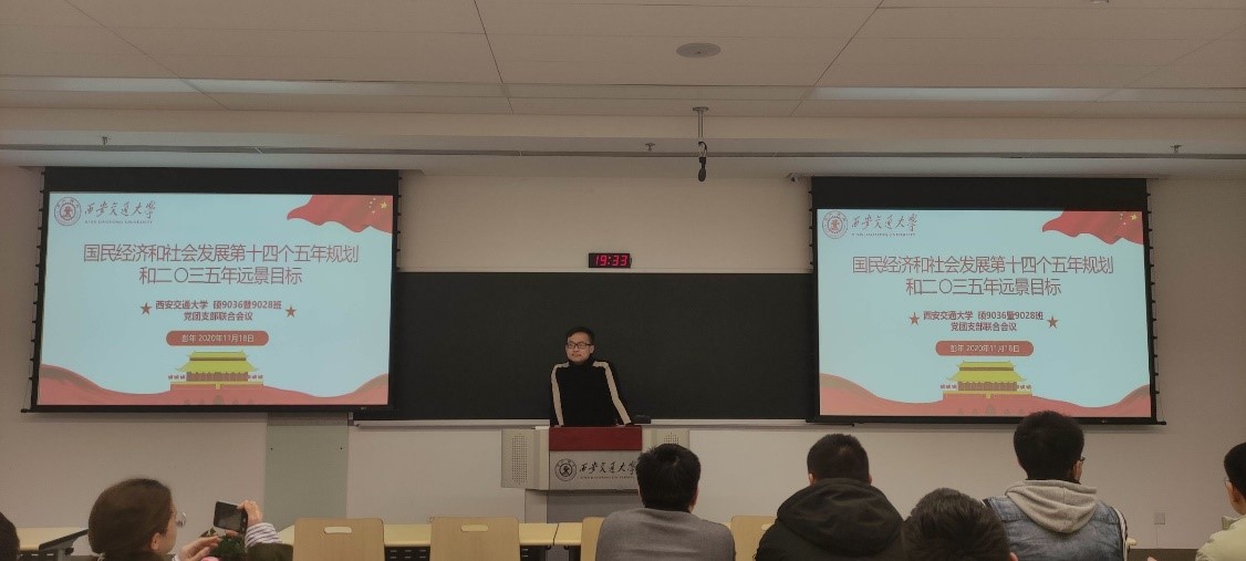 会议第一项,由9028班党支书彭年同学带领大家学习《中共中央关于制定国民经济和社会发展第十四个五年规划和二〇三五年远景目标的建议》。彭年同学首先分析了目前的国内外环境和“十四五”规划编制时间表,让大家对“十四五”规划的重大历史意义有了深刻的认识。接着,彭年重点从“十四五”时期经济社会发展指导方针和主要目标;坚持创新驱动发展,全面塑造发展新优势;加快发展现代产业体系,推动经济体系优化升级三个方面进行解读。同时,彭年从自身实践出发分享了对“内卷、打工人、学历贬值”和“‘十四五’时期政策指引下研究生职业规划”的看法,他认为我们研究生应当摆正心态、提升技能、适应变化,职业规划应往国家需求上靠、服务国家。