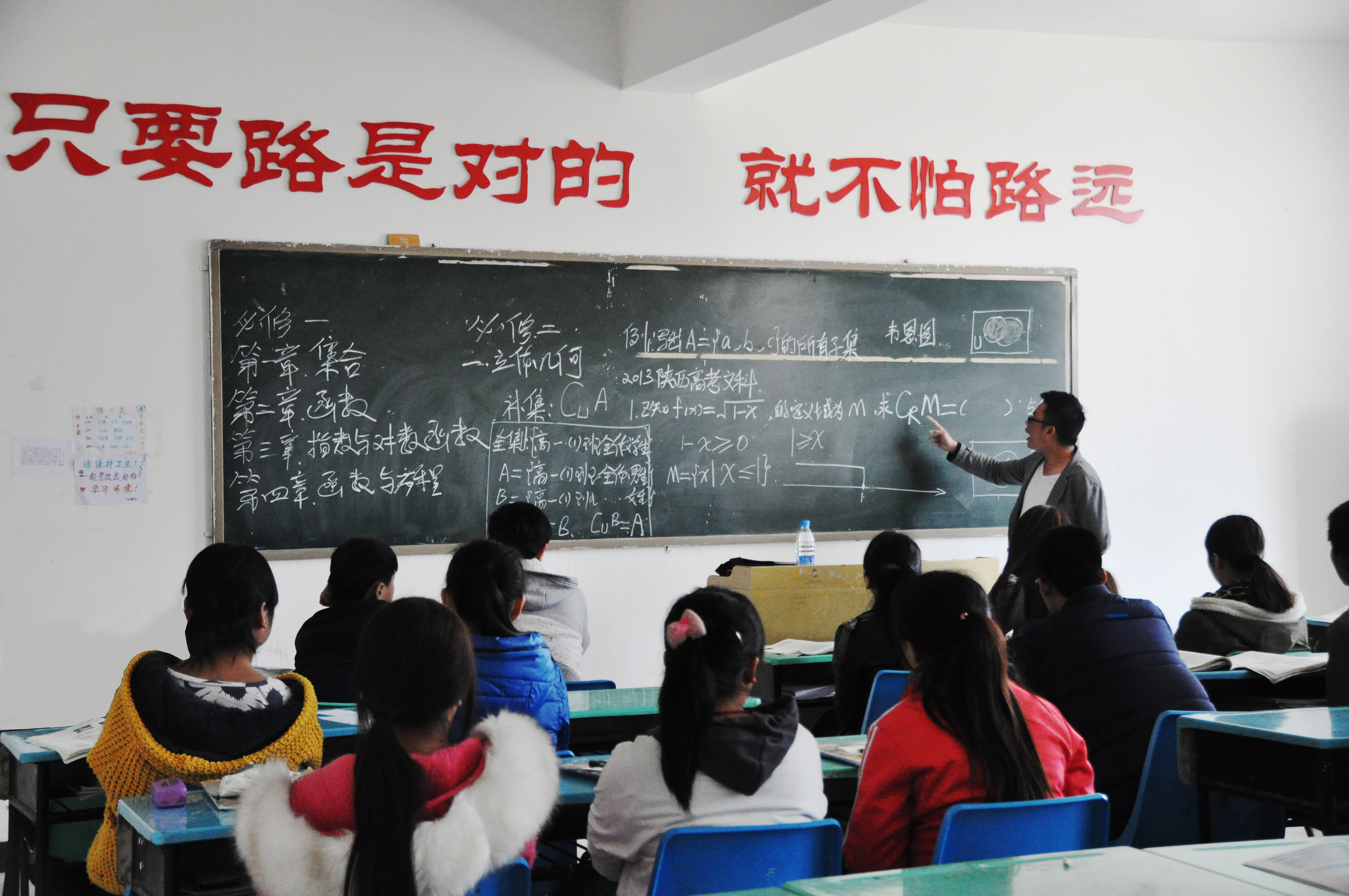 这次支教主要由闫学长、苏鹏师兄和硕3017班的冯想红为不同年级的同学进行授课。闫学长为初二的学生梳理了这学期数学教材的知识点,并对重点难点知识做了详细讲解;苏鹏师兄为高二的学生讲解了高中数学中的难点——函数,并通过习题的训练使同学们对这部分内容掌握的更加透彻;冯想红同学为高一同学讲解了集合,讲解过程生动形象,并多次与孩子们进行互动。