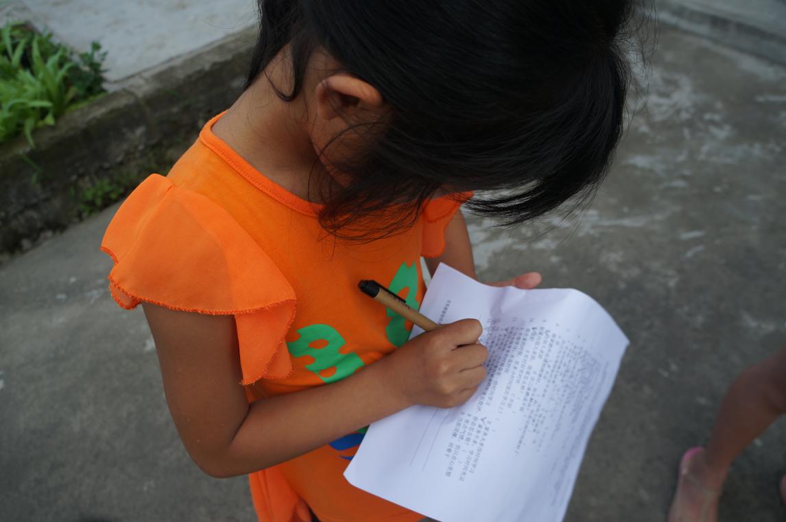 在松河村,志愿者们还遇到一个十一岁的小女孩,上四年级。她的妈妈从她5岁起外出打工,就再也没有回来。爸爸不堪生活重负,也到外地打工,留下年幼的她和爷爷奶奶一起生活。小女孩向志愿者们倾诉说她每天的生活就是上学、做饭、做农活,并且做饭和做农活的时间严重地挤压了她学习的时间,这为她的学习造成了很大的困难。她还向志愿者展示了她的日记本,在日记里小女孩诉说了对妈妈的想念,因为她相信总有一天妈妈还会回到她的身边。这样质朴的愿望让志愿者们感到无比的心酸。