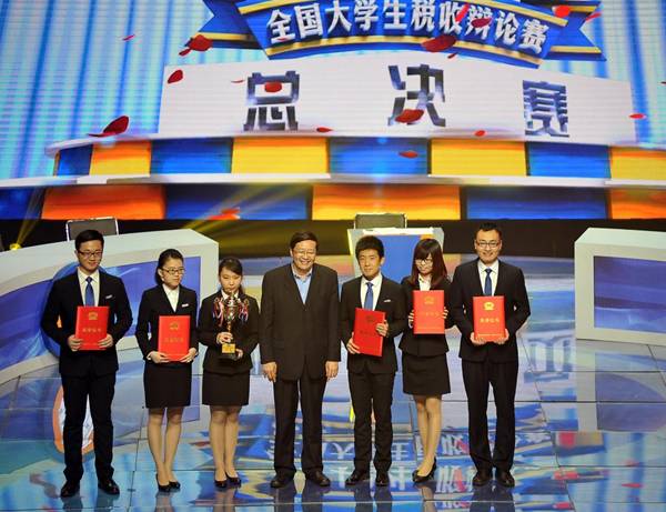 颁发冠军奖杯。央视著名主持人,西安交大校友路一鸣担任辩论赛主持人。 自今年9月开始,由国家税务总局办公厅与共青团中央学校部共同主办以“青春梦想,税与争锋”为主题的全国大学生税收辩论赛。辩论赛共分为北京、上海、大连、武汉、南京、西安、成都和广州八个赛区,经过全国32个省(市、自治区)精心挑选,70多所高校辩论队思辨税收,畅谈未来,通过辩论赛的形式,加深大学生对税收的认知,提高全社会的税收意识和法律意识。