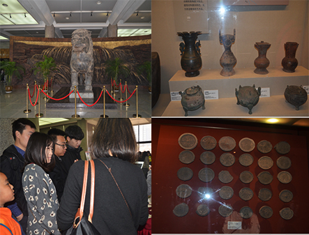 厅中央的这尊巨狮原位于唐女皇武则天的母亲杨氏的顺陵前。它雕刻精美,造型雄伟,堪称“东方第一雄狮”。展馆分两层,三个展室,共七个部分:史前;周;秦;汉;魏、晋、南北朝;隋、唐;宋、元、明、清。基本陈列精选2000多件珍贵文物,反应秦扫六合统一天下的青铜剑,兵马俑等。以及显示秦汉的建筑构件、大型瓦当、民族大融合文化遗存,还有反应盛唐繁荣景象的唐代金银器和唐三彩等,并配以遗址模型、图表、照片等辅助展品。同学们此次活动共3个小时,同学们畅游在历史长河,由西周前秦时代,穿越到盛唐长安,最后进入现代社会,纵观万年文化,细品华夏文明。