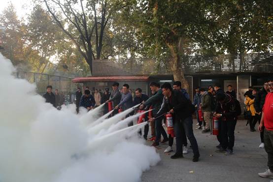 会后,在北二楼前小广场,培训教员现场教大家灭火器的使用方法和注意事项,同学们现场参与了消防灭火演习。