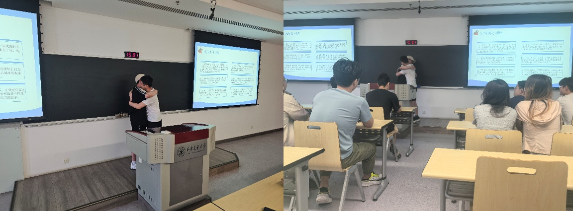 多重感官体验,压力焦虑“无影无踪”。硕4035班首创“烦恼漂流瓶”,同学们匿名书写压力投入瓶中,随机交换后互赠解决方案,实现“非面对面”的互助倾诉。硕4032班与硕4048班则用“同甘共苦转盘”和“压力气球爆破”仪式告别焦虑,同学们在气球上写下“模型报错”“数据异常”等困扰,集体踩爆瞬间引爆全场笑声。硕S3046班设计“一分钟拥抱体验”,伴随《You Raise Me Up》旋律,初始羞涩的同学们最终紧握彼此传递温暖。