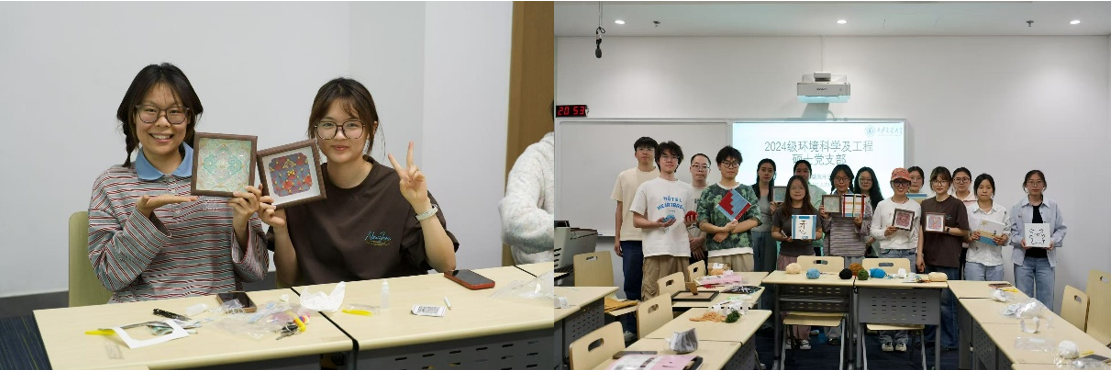以美润心,压力重担“全洗清”。硕3036班与硕3051班用画笔对抗内耗, “把焦虑画出来,好像它就没那么可怕了。”同学们通过艺术的表达,让淤积的情绪得到有效缓解。2024级环境科学与工程硕士党支部结合学科特色,将“生态疗愈”理念植入工作坊,用毛线画、珍珠画创作疏解压力。