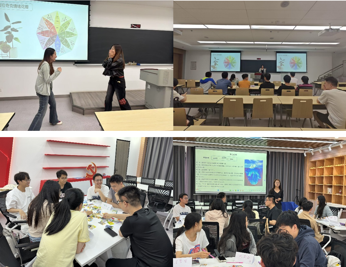 学院聚焦情绪管理核心能力,通过科学工具引导研究生“读懂自己”。硕4036班以普拉奇克情绪花瓣模型为框架,组织学生用肢体语言演绎“喜悦、信任、愤怒”等8种基本情绪,并在小组对比中探索情绪的对立与复合性,直观揭示“情绪住进身体”的反应机制。硕4053班与硕4061班通过OH卡牌,借助意象化图卡激发潜意识表达。有同学抽取“灯塔与迷雾”卡牌后坦言:“科研中的迷茫如同迷雾,而内心的求知欲才是真正的灯塔”,在隐喻对话中实现自我觉察。硕3031班通过拆解“认知陷阱”理论,结合科研场景解析情绪压力链,帮助学生识别“非黑即白”“灾难化思维”等常见心理误区。