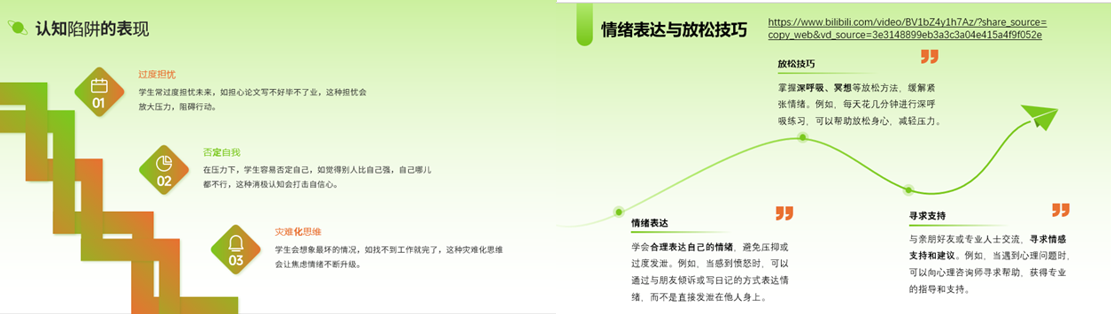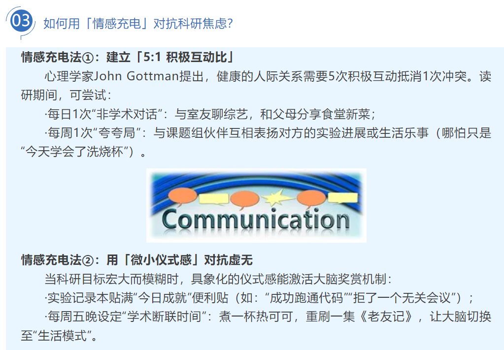 此外,“心理健康守护小技巧”系列科普文章帮助同学们重新认识自我。硕3047班发布《研究生情感充电指南》,提出“5:1积极互动比”法则(5次正向交流抵消1次冲突),并推荐巴赫音乐、自然疗愈等科学减压法,帮助同学们构建积极阳光心态。
