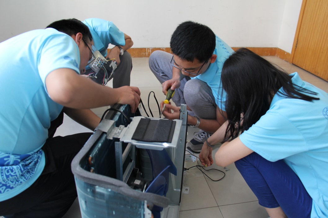 下午,海信为我们安排了与家用空调零距离接触活动,公司十分慷慨的提供了挂壁式和台式空调各一台,作为实践团对整个空调系统内部进行分析的基本设备。早在前一天晚上,实践团已经开会讨论将团队分为两个小组,队员们各自阐述了对空调内部结构存在疑问的部分,为第二天的活动做好充分准备。带着对空调强烈的好奇心,我们开始了空调的拆装活动,内机、外机的拆装在两个小组中轮换进行。大家虽然是第一次拆装空调,但动作麻利,胆大心细。成功拆开空调后,队员们仔细研究了空调各个部件的设计与布置,并发挥交大人特有的严谨和执着精神,对变频技术、分流不均等问题进行了激烈地讨论。此次拆装活动不仅加深了我们对理论知识的理解,而且极大地开拓了我们的视野。纸上得来终觉浅,绝知此事要躬行。