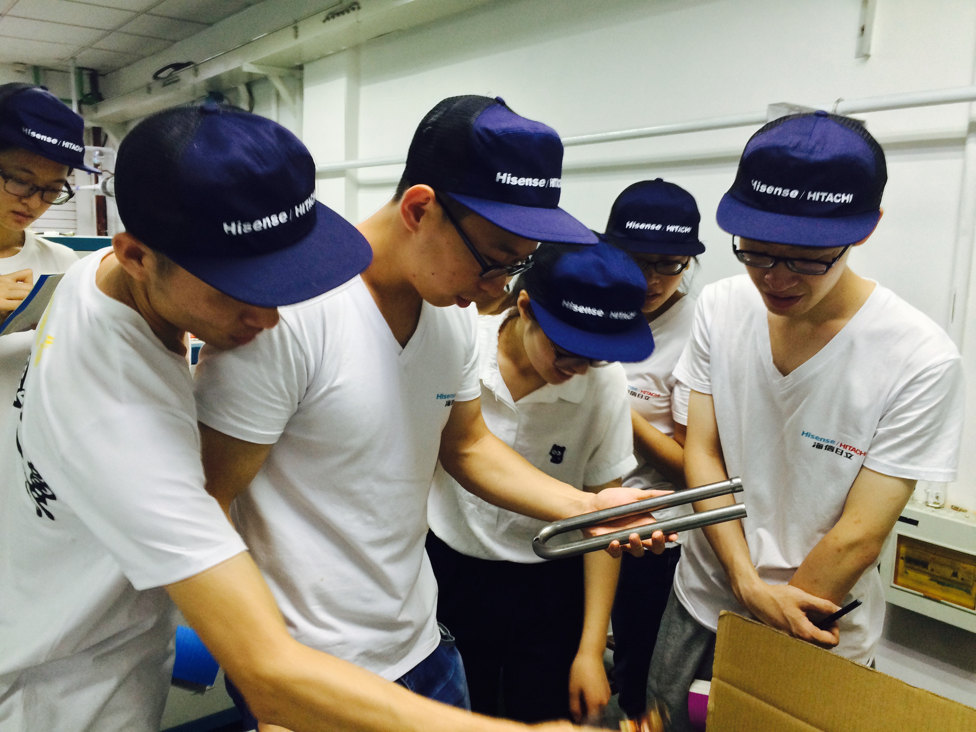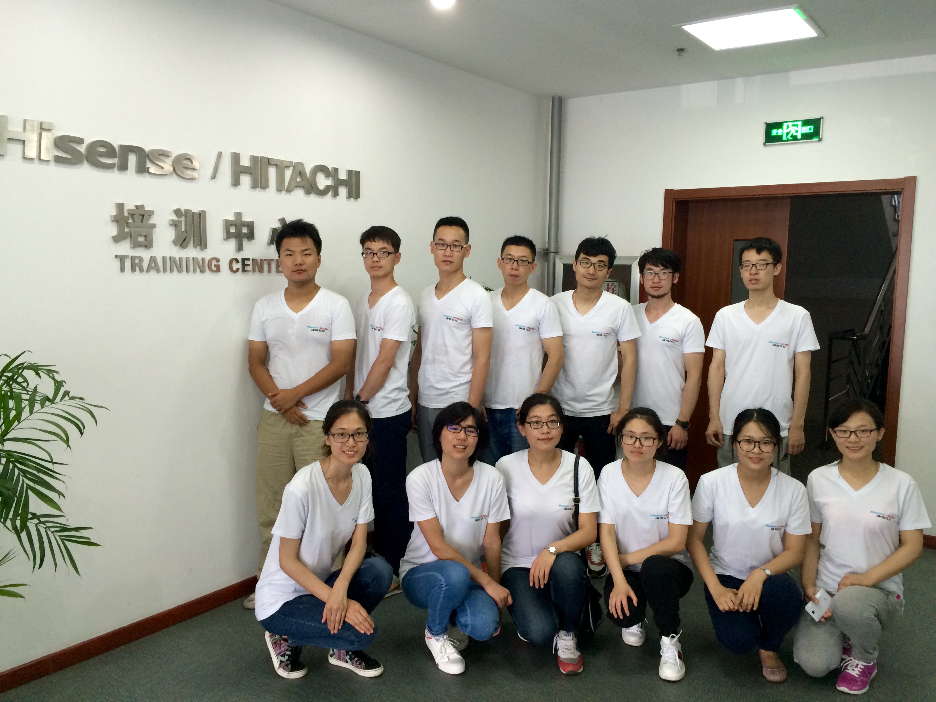 赴青岛海信日立暑期实践团的活动内容主体行将结束,团队成员们依照计划共同完成了实践日(practicingday)、技术日(utilizingday)、应用日(applicationday)的实习活动。在丰富和紧凑的安排下,同学们对海信日立公司的理念和运行有了直观的了解,同时也对自己的择业观和职业观有了新的领悟。实践日的活动集中在制造部,实践团进行了相关课程的学习和制造部流水线的参观;技术日的活动集中在品保部,实践团参观了海信日立的整机实验室,对整机测评的流程有了深入的了解,并且对多联机进行了理论课程的学习;应用日中,实践团走进部品实验室,对多联机空调零部件测评和结构有了深入的学习,并且和91国产