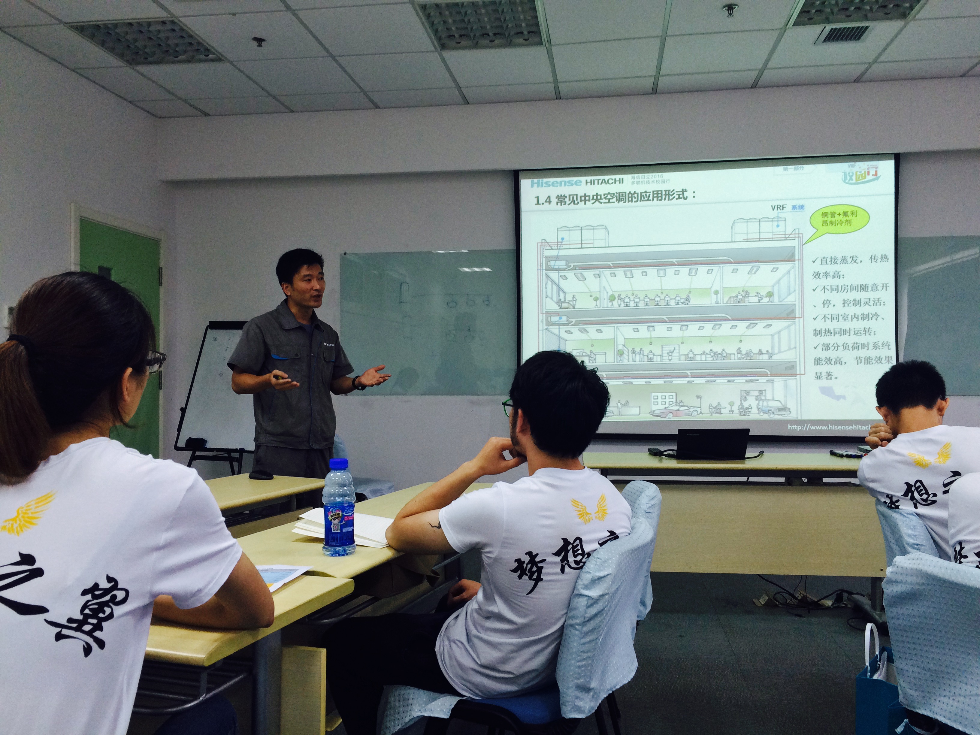 校友刘敏博士给大家分享了多联机空调技术和发展方向,刘博士首先介绍了空调基本知识和行业介绍、制冷空调技术发展和多联式空调调节技术,然后对空调运行基本原理、全球市场容量、按品牌和区域划分的市场和中央空调的应用形式进行深入讲解分析,最后,向大家分享了节能技术研究、新型换热技术及制冷剂发展趋势,并对同学们的提问进行了耐心细致的讲解。此外,大家还以录视频的形式,表达了自己实习几天来的收获,以及对“海信日立梦想之翼·学生夏季营”活动十周年送上的真挚的祝福。