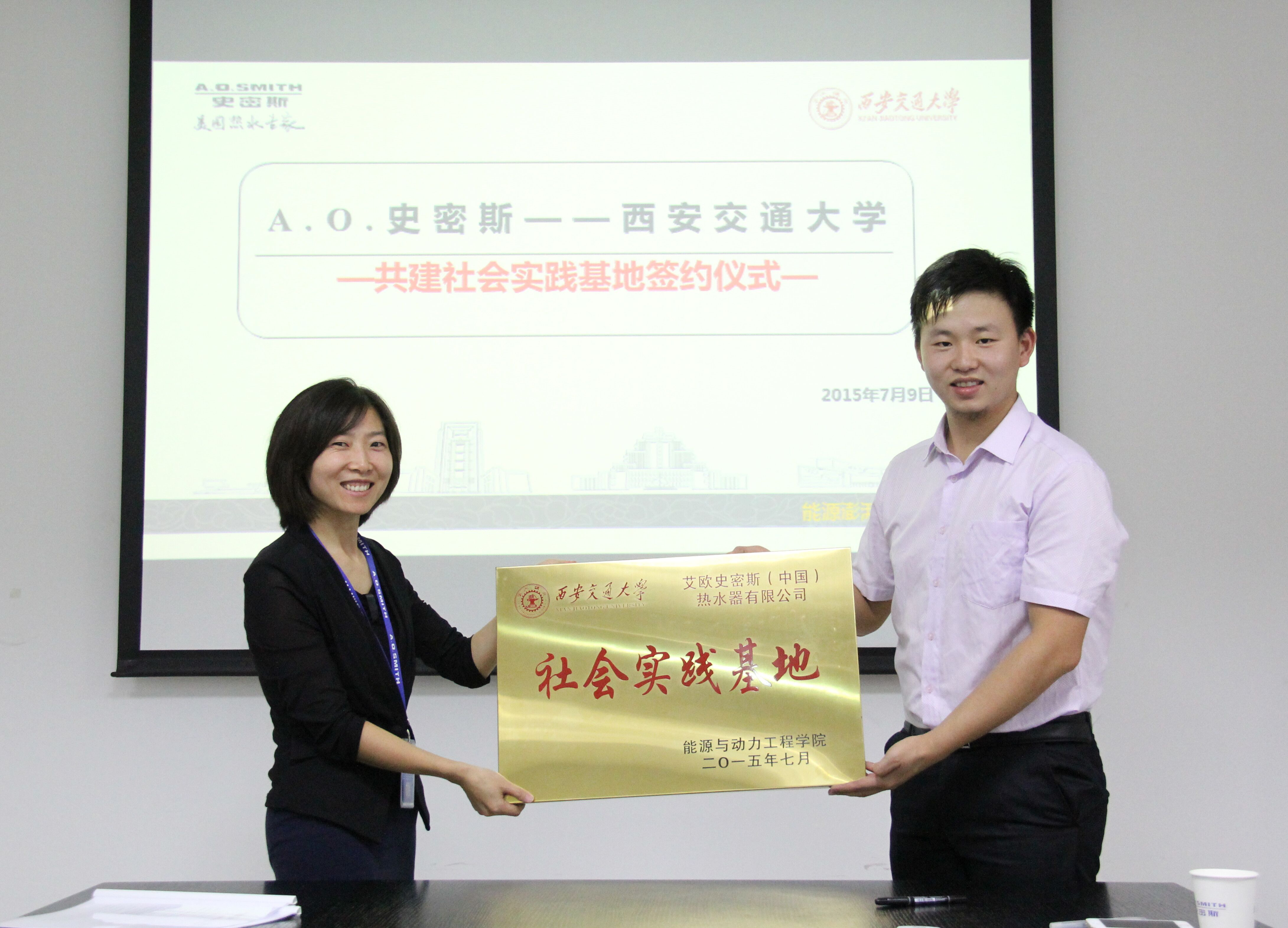 与A.O.史密斯(中国)热水器有限公司共建“社会实践基地”签约授牌仪式,在史密斯全球研发中心会议室隆重举行。A.O.史密斯人力资源经理梁文文女士,燃气研发工程师付子文校友,91国产