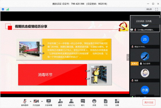 王亦清同志在疫情期间坚持科研学习不放松,已有多篇文章在投,并创建了“DFT与数学建模过程”个人公众号,同时还参与了开封市第二十一中学的抗疫工作。他首先从自身实际出发,分享了在疫情期间坚持科研与做抗疫志愿者的经历与体会。他说,科研是个艰苦的、不断去学习的过程,期间要忍受孤独,需要不断向盲区开拓才会有所收获。鼓励大家积极克服困难,不断提升自我,作为党员,我们应该做好自己的本职工作。他说“在开封市第二十一中学做志愿者时,也没想太多,只觉得党和国家需要我做什么,我就做什么,能尽到自己的一份力量就好”。