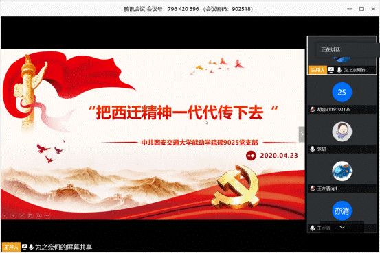 硕9025党支部于4月23日晚上召开了以“把西迁精神一代代传下去”为主题的组织生活会。本次会议由支部书记陈庚主持,王亦清同志结合自身科研、抗疫等相关经历进行交流分享,会议采取线上方式进行。
