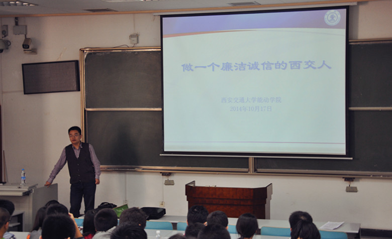 分党委副书记延卫教授首先向在场的党员干部们详细的叙述了近年来发生的几个典型的廉洁反面事例,其中包括有高校科研工作者学术造假及贪污行为,高校毕业生步入社会在工作岗位上行贿受贿行为,以及很多在校大学生们在科研方面存在不良抄袭行为等等。通过这些事例,延卫教授语重心长的对同学们说到,作为交大学子,作为一名共产党员,一定要有做人做事的原则和底线,社会将要比学校更加纷繁复杂,要抵制住不良的诱惑,及时收回想要伸出去的欲望之手,做一个问心无愧的人。同学们都认真的做着笔记,从这些实例中得到了不少的反思。