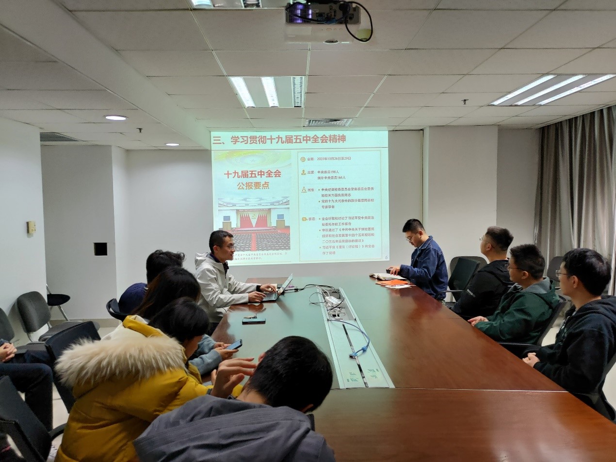 会议第三部分,支部全体成员共同学习五中全会精神。秦浩同志分别从“一个重要判断”、“决胜全面建成小康社会取得的10方面决定性成就”、“我国发展环境面临的深刻复杂变化”、“到二〇三五年要实现的9方面远景目标”、““十四五”时期经济社会发展的6方面主要目标”以及“实现奋斗目标的12方面具体举措”等六个方面介绍了全会主要内容并谈了自己的学习体会。支部成员唐思邈、王阳阳、董春辉,以及新加入党支部的入党积极分子陆凯霖、张衍、姚灏等同志分别结合自身实际交流了学习心得。大家表示,五中全会为我国未来发展进一步指明了方向、提出了更高要求,新的发展阶段、新的发展理念、新的发展格局,使人们看到未来五年中国前行的目标和路线图,更可感知中国的发展愿景。作为博士研究生,一定要立足自身实际,在科学研究上永攀高峰,着力解决“卡脖子”的关键科技问题,力求掌握核心技术,“在危机中育先机,于变局中开新局”,为我国的自主创新做出自己应有的贡献,以切实行动发挥党员的先锋作用。